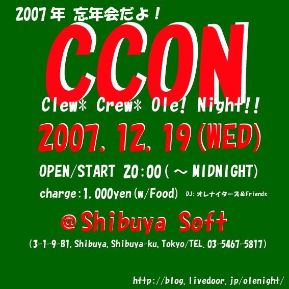 今年のラストは、第三水曜に変更です。そして、本家『俺夜(http://mixi.jp/view_community.pl?id=27610)』との合同忘年会となります。かなりご無沙汰している方々も、会社帰りに、是非「義理で」ご参加ください! 参加表明は、http://mixi.jp/view_event.pl?id=25734269&comm_id=27610の方に書き込んでいただけると嬉しいです。 『Clew*Crew*Ole!Night!!(くるくるオレナイト)』 @渋谷Soft(http://mixi.jp/view_community.pl?id=83126) OPEN/START 20:00(〜各自の終電まで/終電を逃した場合は自己責任で対応) DJ:オレナイターズ&Fri