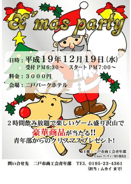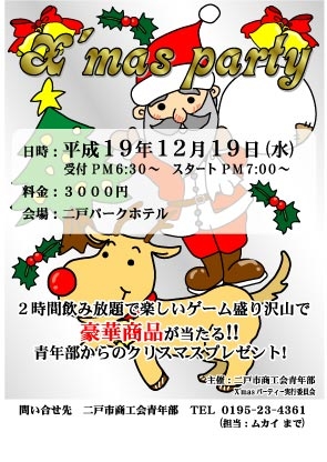 今度、私が入ってます。商工会青年部が主催で 『クリスマスパーティー』を行います。 是非、参加してください。 2007年12月19日(水) 受付_6:30 スタート_7:00〜 会場は『二戸パークホテル』 チケットは3000円です。 内容としましては食い物はバイキング形式で 2時間飲み放題でちょっとしたゲームで豪華商品が当たります。 言っていいのかわかりませんが2万ぐらいの旅行券とか豪華です。 簡単に言うとビール祭りのようで更に人数がそんなに多くないので豪華商品が当たる確立は高いと思います。 ですので飲み会の一次