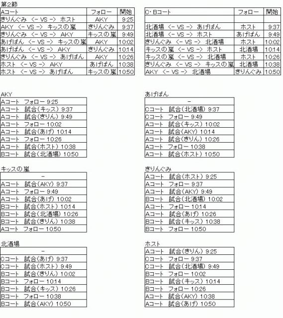 ISKリーグ07−08 第2節を開催します(。・ω・。)ノ~~ 場所:フットサルコミュニティー佐倉 http://www.football-com.jp/sakura/ 日時:月日(水)21:00〜23:00 コート:4コートです。スケジュールをご確認下さい。 21:00−23:00 A・Cコート 22:00−23:00 A・Bコート Aコート (フォロー) 開始 きりんぐみ <- VS -> ホスト (AKY) 9:25 AKY <- VS -> キッスの嵐 (きりんぐみ) 9:37 きりんぐみ <- VS -> AKY (キッスの嵐) 9:49 あげぱん <- VS -