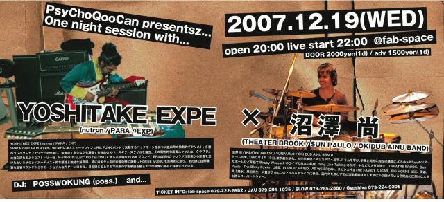 国内外メジャーアンダーグラウンド問わず様々な活動を続け、アドリブ人気投票国内ドラマー部門で第一位の名実共に圧倒的な人気を誇るスーパードラマー!! 沼澤尚と独自の演奏法で唯一無二の音色を奏でる、nutronやparaなど様々なバンドで活動中のスペースギタープレイヤー!! YOSHITAKE EXPEがfab-spaceにてセッションライブ披露!! 関西圏ではなかなかお目にかかれないワンナイトセッション!! 沼澤尚 (THEATER BROOK / SUNPAULO / DUB AINU BAND) http://www.numazawatakashi.com/ 大学卒業と同時にL.A.の音楽学校PIT(Percussion Institute