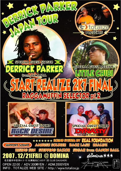 TOTALIZE PRESENTS START REALIZE 2K7 FINAL RAGGAMUFFIN SELECTOR pt.2 DERRICK PARKER JAPAN TOUR SPECIAL GUEST SINGER DERRICK PARKER from JAMAICA SPECIAL GUEST DEEJAY LITTLE CHIBI SPECIAL GUEST SOUND ROCK DESIRE DYNASTY RESIDENT SOUND TOTALIZE SOUND AMBUSH SOLDIER BACK LASH REALIFE RISING SUN STEPPING RAZOR SUGAR from CANON BALL SOUND SYSTEM BY REAL FOUNDATION @DOMINA(旧CLUB DAUGHTER) OPEN22:00 ADV3000YEN ADM3500YEN SUPPORT Aaty APPLETON EL INTERNATIONAL 一徳 ICHIMUA