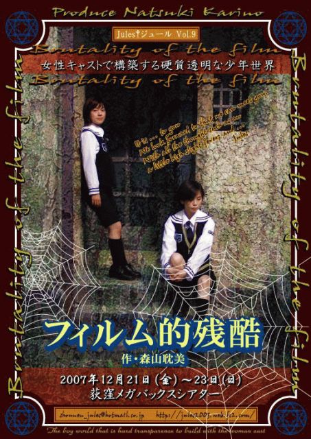 「女性キャストで構築する硬質透明な少年世界」 2007年12月21日(金)〜23日(日) Jules†ジュール Vol.9 『フィルム的残酷』 【作】森山耽美 ◆当日精算券(前売り料金でご覧になれるチケットです)をご希望のお客様は、 メールにて<郵便番号・住所・お名前>をご記入頂き、ご請求下さい。 ◆公演の詳細は、ホームページやblogでもご紹介しています。 ============================= 僕らには、夢も未来もある! 平凡に、そして騒がしい、僕らの寄宿舎に季節外れの転校生。 妄想に囚われて