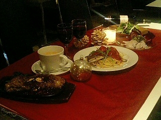 今年も残すところ後1ヶ月! 早いものですね〜。1年は。 毎年恒例、好評のクリスマスディナーのお知らせです。 今年もjadeクリスマスディナーコースをご用意いたしました。 内容は、スープ、前菜、主食、メーン、デザートに食前酒、アフターソフトドリンクの 2ドリンク付き。 毎年好評なのが、前菜(肉系、魚系)、主食(パスタ、リゾット)、メーン(肉系、魚系) からお選びできるチョイスシステム。 苦手な食事がなければ、別々にご注文いただくと なんと2人で、合計8種類のお食事が出来るようになっています。 そしてもう一つ