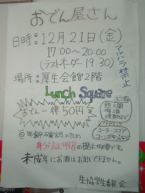 今年の梨大バイク乗りコミュの〆は第2回落書き大k…、もとい、おでん祭りでいかがですか? 開催場所はビアガーデンの時と同じく、学食ではなく厚生会館2階のLunchSquareとなります。 前回のビアガーデンでは梨大生以外でもな勢いだったので 他大学の方や社会人の方もぜひどうぞ☆ ただし、梨大に駐車する事はできませんので、自動車以外の方法でお越し下さい バイクを使う方は飲酒運転を禁止します。 その他、詳しい事は画像を参照して下さい。 遅刻、ドタ参、ドタキャンです。 みなさんの参加、