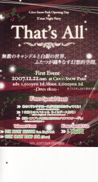 いやいやぁ〜明日は職場のクリスマス会でハンドベルをやる事になってしまった僕です じゃあ昨日のヤバイイベントの詳細です↓ [CRICO SNOW PARK OPENING DAY] [X'mas Night Party] That’s All 「無数のキャンドルと白銀の世界、ふたつが織り成す幻想的空間…」 2K7. 12.22(土) @CRICO SNOW PARK Ticket ・adv \1500 ・door\2000 (全てナイターチケット+1d付) チケット以外で1500円お支払い頂くとホテルにも宿泊可能 Open 18:00〜Till Late とうとうやりますスキー場貸し切りイベント in CRICO