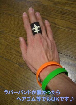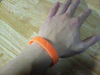 今年もやりますオレゴム&ハイタッチ!!! 新参者もベテランも垣根はないぜこれだけは!!! やり方は簡単!! 右手にmixiカラーのオレンジのラバーブレス(通称オレゴム:写真参照)をつけること!! そして、オレゴムつけてる人をみつけたらまずは『合言葉』を・・・ ◆見つけた人『音楽ないとーー?』 ◇見つけられた人『年越せなーい!!』 そして、ハイタッチ!!!『イェーイ!』 更に談笑して仲良くなりましょう!! mixiネームとか聞けばフェス終了後もマイミクになれるかも!? フェスの楽しみはライブを観ることだけじゃな