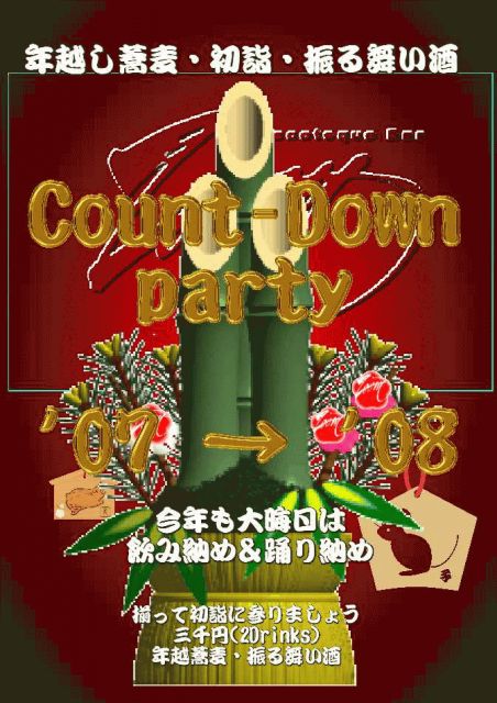 ☆千葉在住の皆様 及び ☆千葉方面(千葉神社・成田山・船橋大神宮…etc)へ初詣のご予定の皆様 ♪大晦日は終日運転です! チョット早めにお出かけ下さい(笑) ◎¥3000/お好きな2ドリンク)◎ ↓〜プラス〜↓ ♪まずは『年越し蕎麦』 ♪カウントダウンには『クラッカー』! ♪明けたら『振る舞い酒』 ゴキゲンなサウンド&ダンスで 〜2007年 踊り納め〜 〜2008年 踊り初め〜 ♪NON−STOP&Fever! 今年も お世話になりました。。。 m(__)m 来年も ヨロシクです! (^O^)/