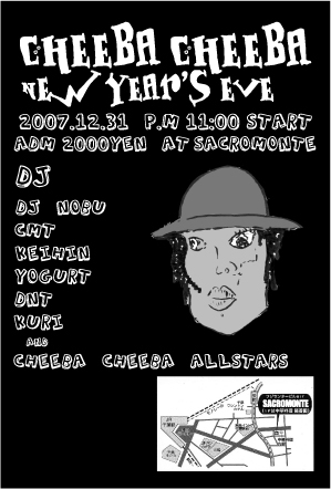 大晦日!!!!!!!!今年もやっちゃいます!!!!!!!! 2007.12.31. CHEEBA CHEEBA NEW YEAR'S EVE @ SACROMONTE(千葉) 23:00〜 2000YEN DJ NOBU CMT KEIHIN YOGURT DNT KURI AND CHEEBA CHEEBA ALLSTARS!!!!!!!!!!!!!!!!!!!!!!!!!!!!!!!!!!!!!!! pm11:00:open timetable chiba djs ↓ yogurt(upsets) ↓ ryosuke(future terror) ↓ kurusu(future terror) ↓ DNT(fol) ↓ kuri(ghetto love) ↓ dj nobu(future terror/ghetto love) ↓ CMT(sbm) ↓ keihin(honcho soun