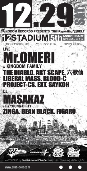 管理人様告知失礼します。 史上初!!大晦日の超ダンスエンターテイメント 『SUPER FRIDAY GRAND CHAMPION SHIP 2007& カウントダウンパーティー』 http://mixi.jp/view_community.pl?id=286098 ●公演日:2007.12.31(月/大晦日) OPEN 16:00 SHOW START 17:00 BATTLE START 19:00 CLOSE 27:00 ●会場 :新宿face ●電話 :TEL 03-3200-1300 FAX 03-3200-1301 ●チケット料金:※入場時1ドリンク代500円が必要となります。 RS席(指定)【リングサイド】:前売り 5,000円 当日 5,500円 自由席及びスタンディング:前売り 4,000