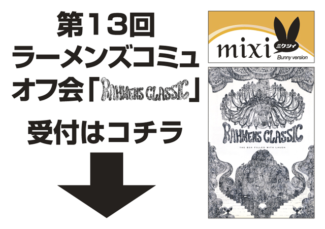 どもども。ダメダメ幹事のけーりん3号でございます。 早いもので、「ALICE」の東京千秋楽日に行われた第1回の開催から 3年が経とうとしています。 今回は新年会を兼ね、かつ「ラーオフ@東京3周年」を記念して 第13回ラーメンズ・コミュオフ会「CLASSIC」@東京 を開催させていただきたいと思います! ◆日程/2008年1月26日(土) ◆開催地/新宿 ◆時間/ 一次会集合予定時間18:00〜 二次会終了予定時間〜23:00 今回も毎度おなじみの一次会・二次会の二部制になります。 なのでご参加の皆さまは「一次会のみ」or「二次会のみ」or 「