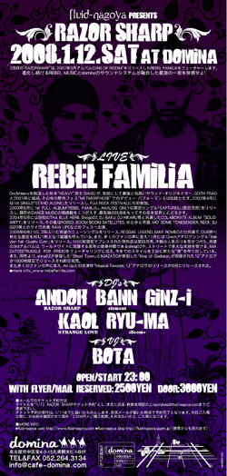 ¹ðÃμºÎ餷¤Þ¤¹¡ª 2008/1/12(sat) fluid-nagoya presents "RAZOR SHARP #02" at cafe domina (ex. Club Daughter) 23:00 open/start with flyer / mail reserved:2500 yen door:3000yen ¢£¥á¡¼¥ë¤Ç¤Î¥Á¥±¥Ã¥ÈͽÌóÊýË¡: ¥¿¥¤¥È¥ë¤ò"1/12 RAZOR SHARP¥Á¥±¥Ã¥ÈͽÌó"¤È¤·¡¢ ËÜʸ¤Ë»á̾¡¦Ëç¿ô¤òÌÀµ¤Î¾å¡¢ razorsharp@fluid-nagoya.com ¤Þ¤Ç¤´Ï¢Íí²¼¤µ¤¤¡£ ¥Á¥±¥Ã¥ÈͽÌó¤Î¼õÉդϡ¢1/11¤Þ¤Ç¤ËÆÏ¤¤¤¿¤â¤Î¤È¤·¤Þ¤¹¡£ ÊÖ¿®¥á¡¼¥ë¤¬ÆÏ¤¤¤¿»þÅÀ¤ÇͽÌó´°Î»¤È¤Ê¤ê¤Þ¤¹¡£ ÅöÆü¤´Æþ¾ì¤ÎºÝ¤Ë¡¢¤ªÌ¾Á°¤ò³Îǧ¤µ¤»¤ÆÄº¤¡Ö2500 yen¡ß¤´¹ØÆþËç¿ô¡×¤ò