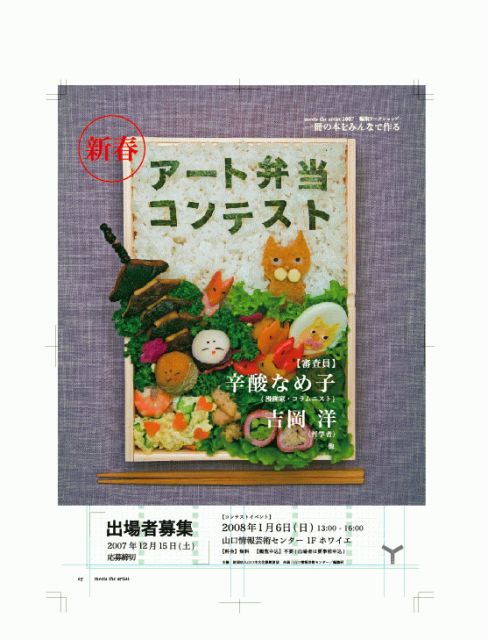を開催します。今回はゲスト審査員に漫画家・エッセイスト辛酸なめ子さんを迎え、市民から広くアート弁当を公募し、吉岡洋さん・辛酸なめ子さんに審査員をつとめていただくコンテストを催します。市民ボランティアが主体となり一冊の書籍を作る長期市民プロジェクトの一環として開催されるものであり、今回のイ