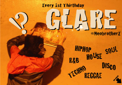 皆様明けましておめでとうございます。 昨年は皆様の助けがあり「GLARE」を楽しく良いEVENTへと成長させていくことができました。ありがとうございました!! 今年もどうか懲りずGLAREを宜しくお願い致します! 皆様が成長させてくれた「GLARE」は今年も日々精進し更にパワーアップさせていきたいと思います!! 気づくともうGLARE!! 新年一発目!!! 1/10 (THU) 『GLARE Vol.7』 @Neo BrotherZ OPEN 21:00 DOOR 1500/(2D) (先着でGLARE DJ's SELECT CDプレゼント) DJ's: TAKESHI Kn2 チェ・ゲバラ ELTONG キ