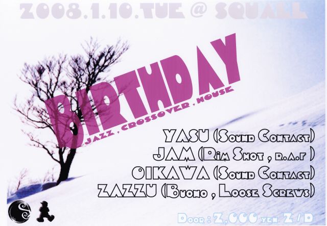 2008年1月10日(木)21:00〜 @CLUB SQUALL 『BIRTHDAY』 JAZZ , CROSSOVER , HOUSE ADV ?2,000 2D DJ YASU DJ OIKAWA DJ JAM DJ ZAZZU 新年1発目のBIRTHDAY! 今回から、JAM氏とZAZZU氏が正式メンバーとしてスピンすることになりました。 是非是非、遊びに来てみて下さい。