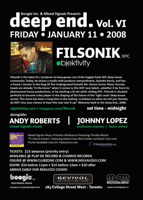 Filsonik is the latest DJ / producer to have grown out of the hugely lively NYC deep house community. Today, he shares a studio with producer extraordinaire, Quentin Harris, and has a friend / mentor in the King Of The Underground himself, Mr. Dennis Ferrer. Many Toronto heads are already “in the know” when it comes to this HOT new
