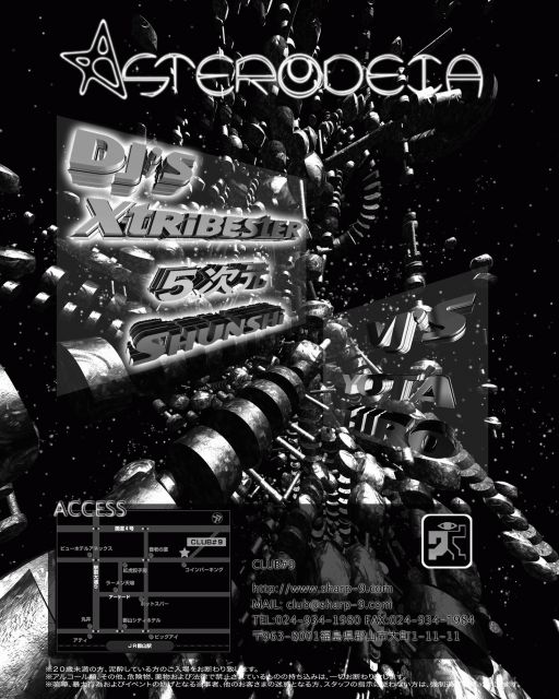 前回ASTERODEIA COUNTDOWN PARTY に来てくれたみなさんTHANKS!! 最高の年明けでした!!今年もよろしくです!!! そしてもう来ました、新年会です!! 是非是非あそびましょう:) DJ XTRIBESTER SHUNSHI 5次元 VJ YOTA HIRO FLYER DESIGN MYSTIKALION A.K.A MIKIO tickets 前売り1500円(1drink付) 当日2000円(1drink付) e-mail:asterodeia@hotmail.com … …… ……… ………… …………… ※20歳未満の方、泥酔している方のご入場をお断わり致します。 ※アルコール類、その他、危険物、