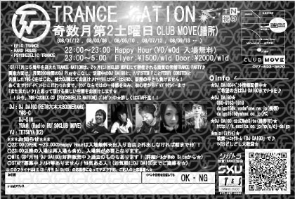 『TRANCE NATION〜Happy New Year スペースシャトル〜』 <日時> ・2008.1.12.Sat(奇数月第2土曜日) 22:00〜5:00 <場所> ・CLUB MOVE(滋賀県大津市 膳所) <料金> ・Flyer:\1500/w1d ・Door:\2000/w1d →事前にご連絡頂ければ、ゲスト(\1500/w1d)とります♪ <ジャンル> ・EPIC TRANCE ・HARD HOUSE ・PSYCHEDELIC TRANCE <DJ> ・DJ DAIGO(RET@六本木FIREWALL BAR) ・Y@S-C ・DJ SIN <VJ> ・TETSUYA(K2) ・アニキ <コメント> 昨年11月に5周年を向かえたTRANCE NATIONは、2ヶ
