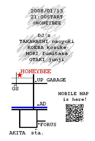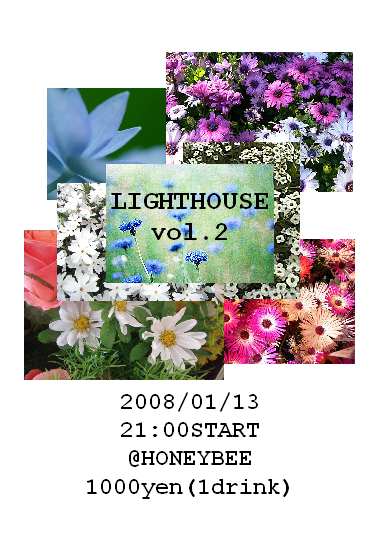 管理人様、告知失礼いたします。 1月13日(日)に、秋田山王HoneyBeeにて、LIGHTHOUSEを催させていただきます。 1/13 @HoneyBee 1000yen (1 Drink) Open: 21:00〜 DJs TAKAHASHI naoyuki MORI fumitaka OTAKI junji KOEBA kouske 「ハウスミュージック、ジャズをもっと気軽に」 をコンセプトにしております。 一同、皆様のお越しをお待ちしております。 貴重なスペースありがとうございました。