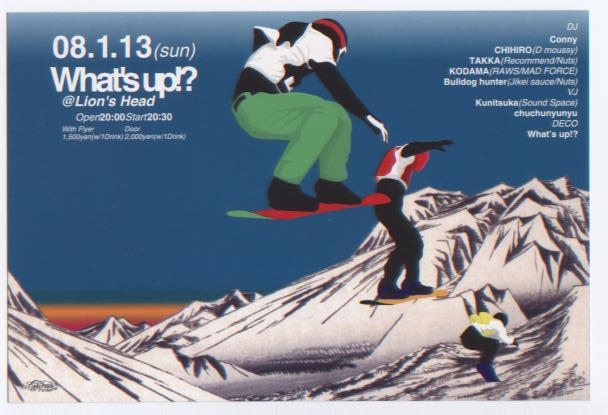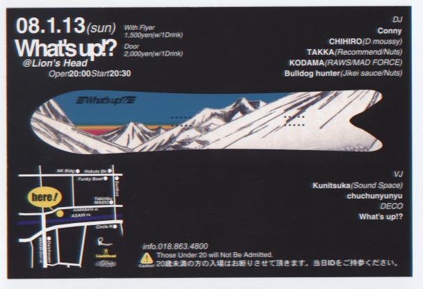 管理人様、告知失礼いたします。 3回目のWhat's up!?を開催いたします。今回はDECO(デコレーション)も兼ね備え、今までとは違った空間作りをする予定です。 電飾を使っての空間の中で、HOUSE MUSICをご堪能ください。 今回はJikei sauceよりBulldog HunterことガリョーもDJとして参加いたします。 ◆ What's up!?@ Lion's head (HOUSE) 2008年1月13日(SUN) OPEN 20:00 START 20:30 with Flier \1500 (1 drink) Door \2000 (1drink) DJ Conny CHIHIRO(D MOUSSY) TAKKA(RECOMMEND/NUTS) Bulldog