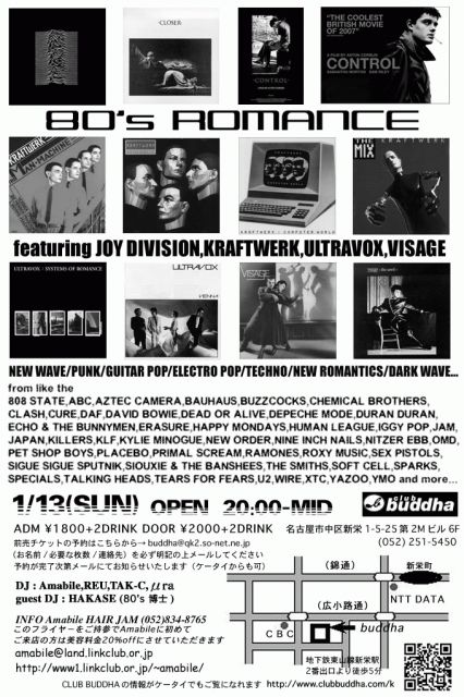 1/13 (日) 80's ROMANCE featuring JOY DIVISION, KRAFTWERK, ULTRAVOX & VISAGE 20:00-MID @ club buddha DJ : Amabile,REU,TAK-C,μra & Special Guest HAKASE (80's 博士) 前売り 1800yen+2DRINK 当日 2000yen+2DRINK club buddha 名古屋市中区新栄1-5-25第2Mビル6F (052)251-5450 NEW WAVE/PUNK/GUITAR POP/ELECTRO POP/TECHNO/NEW ROMANTICS/DARK WAVE... 808 STATE,ABC,AZTEC CAMERA,BAUHAUS,BUZZCOCKS,CHEMICAL BROTHERS, CLASH,CURE,DAF,DAVID BOWIE,DEAD OR ALIVE,DEPECHE MODE,DURAN DURAN, ECHO & THE BUNNYMEN,ERASURE,H