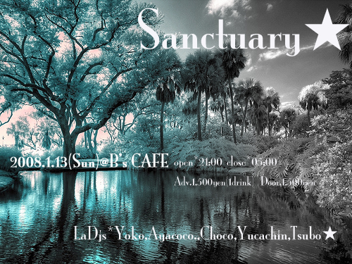 Sanctuary★ 2008.1.13(sun)@B'S CAFE OPEN PM9:00 CLOSE AM5:00 ADV.1,500YEN (WITH 1 DRINK) DOOR. 1,500YEN DJ'S /YOKO,AYACOCO.,CHOCO,yucachin,TSUBO★ 今回は女性DJのみのイベント