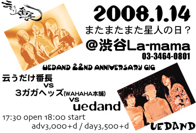 uedand 22nd anniversary gig またまたまた星人の日? 2008.1.14(mon/holiday)shibuyaLa-mama 0334640801 17:30 open/18:00 start チケット前売3000+D 当日3500+D 出演:uedand/3ガガヘッズ(WAHAHA本舗)/云うだけ番長 opening act:中村貴人 with 市川"JAMES"洋二(ex.STREET SLIDERS/ZIGGY support) チケットは12月14日から渋谷ラママで発売。 問い合わせ:渋谷ラママ0334640801