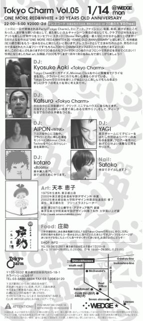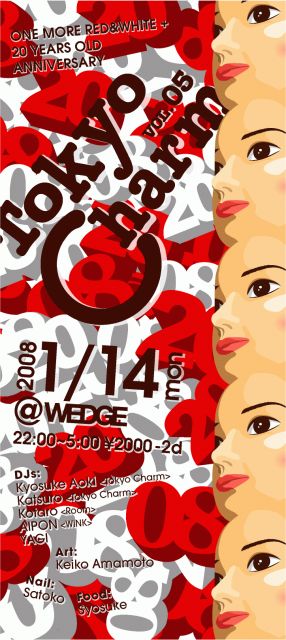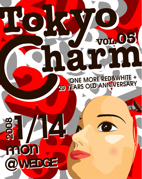 1/14 (mon) Tokyo Charm Vol 5@WEDGE 『ONE MORE RED&WHITE+20 YEARS OLD ANNIVERSARY』 Tokyo Charmコミュ http://mixi.jp/view_community.pl?id=2083797 Open/22:00~5:00 ADV/2000/2d 『Djs』 kyosuke aoki(ALPHA) Katsuro(ALPHA) Kotaro(ROOM) AIPON(WINK) YAGI 『Neil』 Satoko 『Art』 天本 恵子 似顔絵 500 天本 恵子ホームページ http://www.amamotokeiko.com/ 『Food』 庄助 二ヶ月に一回で開催されるParty『Tokyo Charm』 主にアー