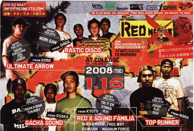 告知失礼します。。 2008年一発目の「RED X」は新春特別企画!! お年玉を賭けて、京都・大阪・滋賀・神戸・奈良より現在活躍中の若手サウンドが歌い手も引き連れて集合し、エリア対抗で盛り上げ合戦!!!今年平成弐拾年・ネズミ年はどこの地域の誰が一番ヤバイのか!?あなたの目で確かめに来て下さい。 もちろんラバダブ合戦も予定しております、歌い手にも注目!サプライズもあるかも・・・ 更にとってもかわいいテキーラガールも登場するとのウワサが・・・ まだまだ正月気分で楽しい夜を一緒に過ごしましょう♪ もちろん数量限定