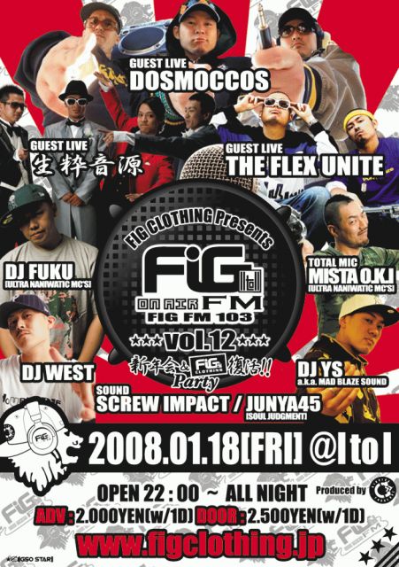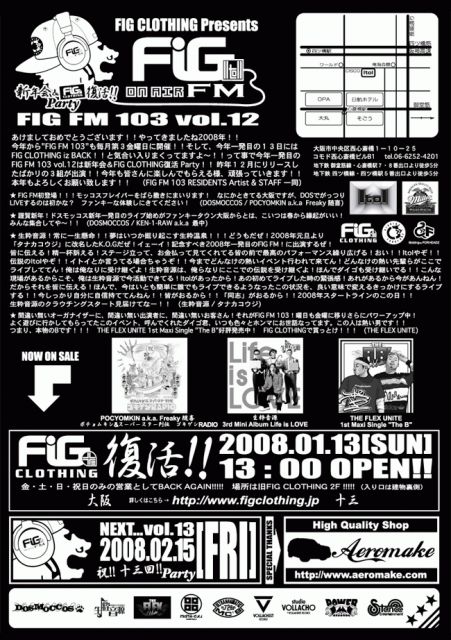 今年から"FIG FM 103"も毎月第3金曜日に開催!!そして、今年一発目の13日にはFIG CLOTHING iz BACK!!と気合い入りまくってますよ〜!!って事で今年一発目のFIG FM 103 vol.12は新年会&FIG CLOTHING復活 Party!! 昨年12月にリリースしたばかリの3組が出演!!今年も皆さんに楽しんでもらえる様、頑張っていきます!!本年もよろしくお願い致します!!