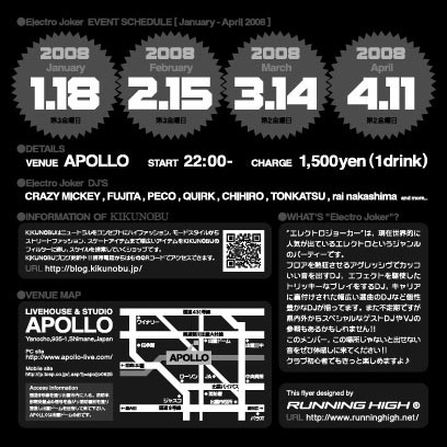 [Electro Joker Vol.13] 2008.1.18 FRI. 21:00~ VENUE / APOLLO http://www.apollo-live.com/ DJ / CRAZY MICKEY. QUIRK. PECO. CHIHIRO. FUJITA. TONKATU. RAI NAKASHIMA. GUEST DJ / HAKASE. FEE / 1500yen-(1drink)です 1月のエレクトロジョーカーで、1周年を迎える事になりました!! これも皆様のおかげです!!ありがとうございます!! 今回は新たに加わったDJも含め、DJ総出演でお祭り騒ぎです!! 先着でエレクトロジョーカーの缶バッジ差し上げます(数量限定) エレクトロを軸に、バイレファンキや