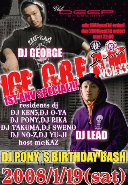 ハイ!!!2007年1月にSTARTした“ICE C.R.E.A.M.”も早くも一年がたちました!!!一周年を記念して次回、1月のICE C.R.E.A.M.は1ST ANV SPECIALで大阪からマイメンDJ GEORGEとDJ LEADかお祝いに駆けつけます!!!しかも1月が誕生月のDJ PONYのBIRTHDAY BASHです!!!皆さん是非、お祝いに駆けつけてください!!!