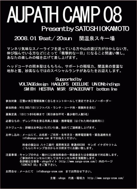 今、人気沸騰中のプロスノーボーダー岡本聖君のキャンプです 雪の多い関温泉だからできる遊び方を、たっぷり教えてくれますよ 彼のスタイリッシュな滑りをぜひ間近で堪能してください。 19日(土)は、まだ若干あいています ぜひぜひご参加ください!!!!!!! 岡本聖HP http://www.okamoto-satoshi.com/ 詳しくはフライヤーをクリック