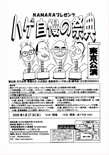 2008年1月19日(土) 出演:月乃光司・柬理行正・久住雅史・昼街夜村(ハゲ四人衆) 司会:江口歩(NAMARA) 参加費:1500(ワンドリンク付) 会場:NAMARA-YA(新潟市古町通5-599 025-224-8001) http://yaplog.jp/namara-opener/archive/2 開場18:30 開演19:00 (終了予定21:00) 問い合わせ:TEL025-222-1125 (NAMARA)
