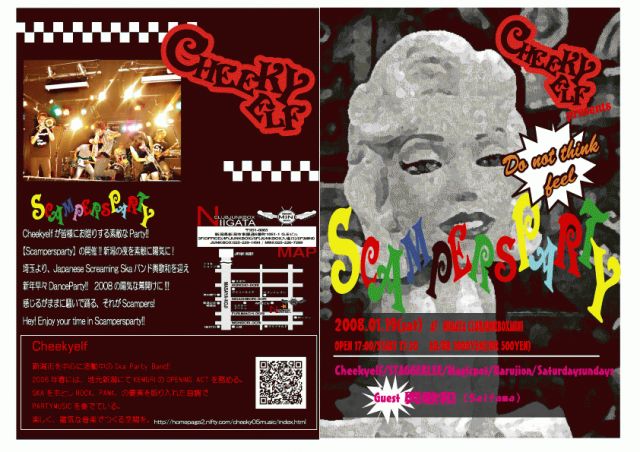 2008/01/19(Sat) at新潟CLUBJUNKBOXmini Cheekyelf presents 【ScampersParty!! vol.3】 Cheekyelf STAGGERLEE Magicpot ハルジオン Just feel Guest 輿歌和(埼玉) open 17:00/start 17:30 tic ad/dr 1,000yen(1dr500yen) お待たせしました!お久しぶりのScampersParty!!は埼玉より、Japanese Screaming Skaバンド輿歌和を迎え、最強に素敵なPartyをやっちゃいます!!新潟からもSTAGGERLEE、Magicpotも参戦!三条からはJust feel!!若さあふれるハルジオンも参戦!! さあ、ビール片手に踊りましょう! チケット予