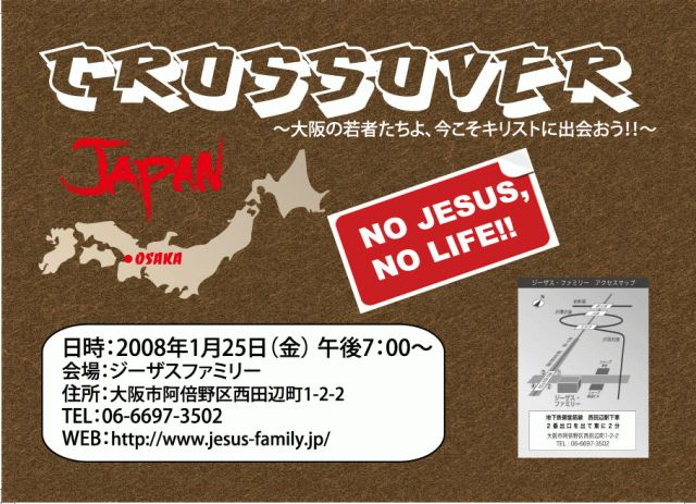 はじめましての人ははじめまして〜〜〜。 久しぶりの人はご無沙汰〜〜〜。 いつも顔合わせてる人はどうも〜〜〜。 とうとう来ました〜〜〜!!! ここ大阪にユースミニストリーが始まります。 その名も「CROSSOVER」 世の中の文化・世界観からキリストの文化・世界観へ越えて行きます。 神と出会い、神を愛し、神に従う。 私たちは、この若い世代が「受身」になるのではなく、自分たち自身で神様を証し、励まし合い、共に立ち上がり、主体的にこれからの教会の伝道、宣教など責任を担っていけるようになること、そして教派を超えて諸教会の