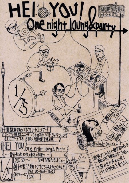「HEI YOU!」-one night loung & party- 追憶の段返りソウルを求めて 「櫻井ィようこミゼットショー」 Vocal櫻井ィようこ Guitar佐藤ゴー 「珍盤駄盤踊るアホウと聴くアホウレコードコンサート」 破廉恥乃シンヂケート別動隊ソウル☆オキュパイドジャパン ローテク偏執ユニット「ソウル☆オキュパイドジャパン」がナビゲートする 目眩く万華鏡音楽の夜 南港アスファルトの継ぎ目に咲いた一輪の花「櫻井ィようこ」を迎え 大阪の北の外れに吹くミナトの潮風を貴方にも 日時 1月25日 8:30Start 場所 B