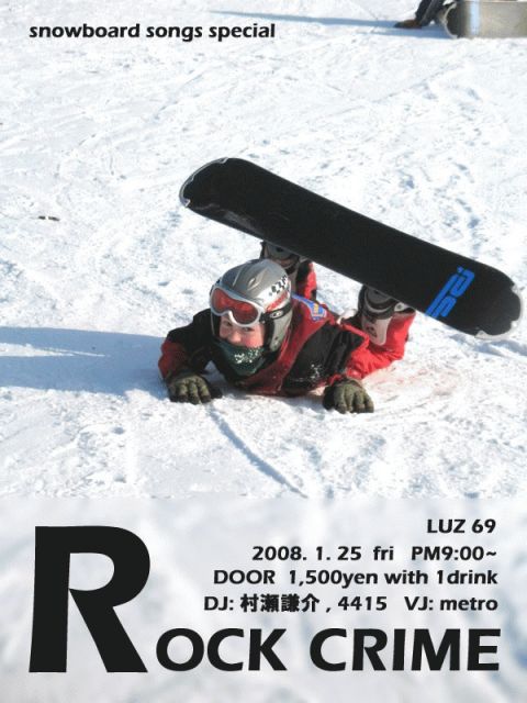 LUZ69にて1月25日金曜日開催。 21時スタート。 1,500円で1ドリンク付き。 今回は村瀬氏と4415に加え、1月3日の正月スペシャルでまわしてくれたmetro氏がVJで登場! 今回の特集「これ聴きながらスノボしたらかっこいいだろなという曲」特集にちなんでスノボの映像もバンバン流してくれるそうです。 リクエストも受付中!