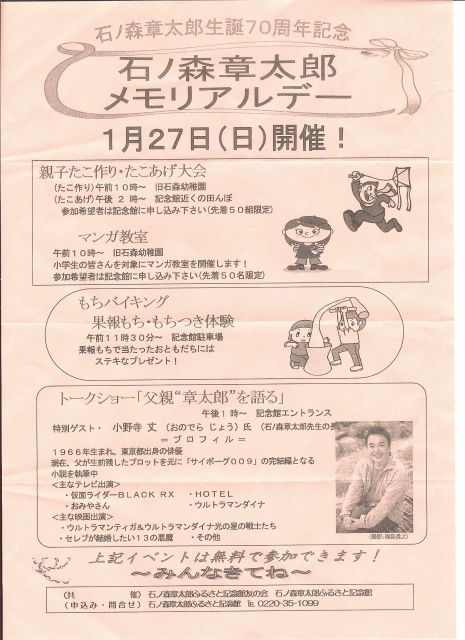 石ノ森章太郎先生のお誕生日は昭和13年1月25日です。 今年は、生誕70周年にあたり、誕生日に近い1月27日(日)にメモリアルデーを開催します。 親子たこ作り・たこあげ大会 (たこ作り) 午前10時〜 旧石森幼稚園 (たこあげ) 午後2時〜 記念館近くの田んぼ 参加希望者は記念館にお申し込みください(先着50名限定) マンガ教室 午前10時〜 旧石森幼稚園 小学生の皆さんを対象にマンガ教室を開催します! 参加希望者は記念館にお申し込みください(先着50名限定) もちバイキング 果報もち