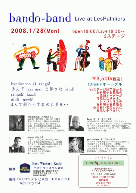 ¥3,500...1drink+オードブル付 1stステージ終了後 料理や飲物追加できます。 レ・パルミエの お料理やお飲物を 心地良い音楽と共に お楽しみ下さい。 以前TIMEEMITとして 来高してくれた 大久保かおりさんと よしうらけんじ君が TIMEEMIT解散後 新しいバンドでやって来ます! 超嬉しい〜〜〜! LesPalmiersでLiveします。 詳しくは下の写真をクリックすると大きいものが見えます。 チケット予約、問合せはこちらへ matthew@baffone.com