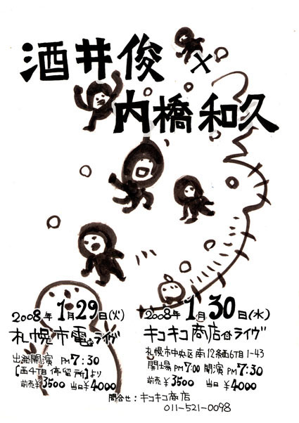 酒井俊×内橋和久 札幌市電×キコキコ商店 2008冬 ライブのおしらせです。 2007年の4月の衝撃ライヴを再び、移動する電車とお店で2days 札幌市内を走る市電に乗車し、 雪の季節、雪景色を電車の中から、眺めながら、 心地よい唄と音を、体感して下さい。 電車の車内という異空間でのライブです。 何とも言えない一体感と不思議な感覚が味わえると思います。 酒井 俊 vo ×内橋和久 g at 札幌市電ライヴ +キコキコ商店ライヴ 1月29日(火) 札幌市電ライヴ (市電に乗りながらの演奏会) 午後7時30分