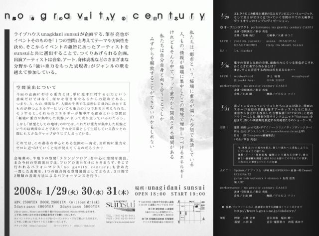 管理人さま、告知失礼します。 【イベント名】 「no gravity century 都市の重力○自芯」 【開催日時】 1月29日、30日、31日 【場所】 unagidani sunsui http://www.sunsui.net/ 〒 542-0083 大阪市中央区東心斎橋 1-12-20 心斎橋シキシマビル B1F (MAPはHPにてご確認ください) (06) 6243-3641 【時間】 全日 OPEN 18:00 START 19:00 【料金】 ADV.2300YEN ( without drink ) DOOR.2800YEN ( without drink ) ※スペシャルチケット(直接unagidani sunsuiにご連絡ください!) 2d