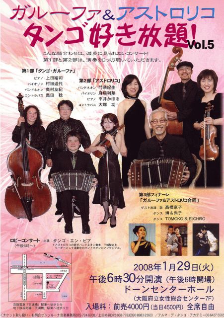 ガルーファ&アストロリコ 「タンゴ好き放題! Vol.5」 ■ 出演: ・ガルーファ ピアノ 上田裕司 / バイオリン 村田道代 / バンドネオン奥村友紀 / コントラバス 奥田稔 ・アストロリコ バンドネオン 門奈紀生 / バイオリン 麻場利華 / ピアノ 平井かほる / コントラバス 大塚功 ・ゲスト : 高橋京子(歌) / 博&尚子(ダンス) / TOMOKO&EIICHIRO(ダンス) ・ロビーコンサート : タンゴ・エン・ビア 会場 : ドーンセンターホール (大阪府立女性総合センター 7F)