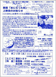 日本最大のダムに沈む村 15年のドキュメンタリー映画「水になった村」上映会のお知らせ 平成20年1月29日(火) 『深谷シネマ』 埼玉県深谷市仲町2-25 TEL:048-551-4592 Web Site:http://fukayacinema.com/ ☆上映時間☆ ○10:30 ○13:30 ○16:30 ○19:30 *最終回上映後に大西監督トーク チケット 前売り1000円 当日 1200円(小中学生無料) 今年の1月、初めての取組として、夜間中学のドキュメンタリー「こんばんは」を上映した仲間達が、来年1月、ふたたび取り組むのがこの映画だ