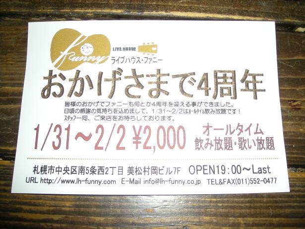 お陰様でファニーも2月2日でオープン4年目となります。 日頃の感謝をこめて1/31〜2/2は飲み放題・歌い放題2,000円です 常連さんも初めてさんも是非是非遊びにきて下さいね!