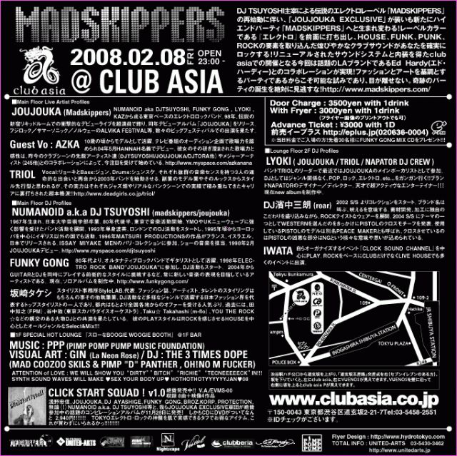 DJ TSUYOSHI主宰による伝説のエレクトロレーベル「MADSKIPPERS」の再始動に伴い、「JOUJOUKA EXCLUSIVE」が装いも新たにハイエンドパーティ「MADSKIPPERS」へと生まれ変わる!レーベルカラーである『エレクトロ』を前面に打ち出し、HOUSE、FUNK、PUNK、ROCKの要素を取り込んだ煌びやかなクラブサウンドがあなたを確実にロックする!リニューアルされたサウンドシステムと内装を得たclub asiaでの開催となる今回は話題のLAブランドであるEd Hardy(エド・ハーディー)とのコラボレーションが実現!ファッションとアートを基調とするパーティであるからこそ