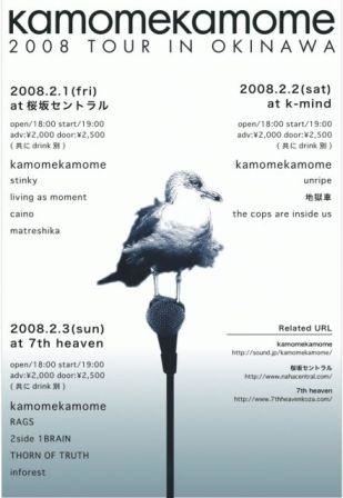 2008.2.1(fri)at桜坂セントラル http://www.nahacentral.com/tell/tell.html open/18:00 start/19:00 adv:\2000 door:\2500(共にdrink別) *kamomekamome(from kashiwa) *stinky *living as moment *caino *matreshika 2008.2.2(sat)at k-mind open/18:00 start/19:00 adv:\2000 door:\2500(共にdrink別) *kamomekamome(from kashiwa) *unripe *地獄車 *the cops are inside us 2008.2.3(sun)at 7th heaven http://www.7thheavenkoza.com open/18:00 start/19:00 adv:\2000 door:\