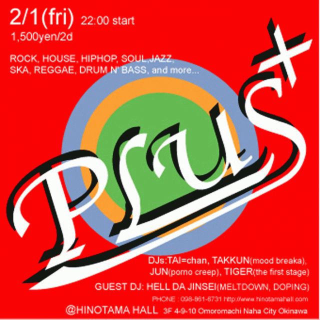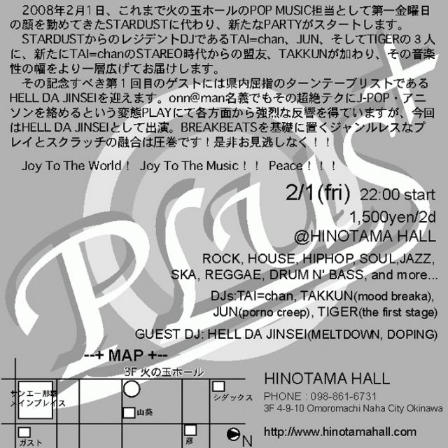 1,500yen/2d DJs:TAI=chan, TAKKUN(mood breaka), JUN(porno creep), TIGER(the first stage) GUEST DJ: HELL DA JINSEI(MELTDOWN, DOPING) ROCK, HOUSE, HIPHOP, SOUL,JAZZ, SKA, REGGAE, DRUM N' BASS, and more... 2008年2月1日、これまで火の玉ホールのPOP MUSIC担当として第一金曜日の顔を勤めてきたSTARDUSTに代わり、新たなPARTYがスタートします。 STARDUSTからのレジデントDJであるTAI=chan、JUN、そしてTIGERの3人に、新たにSTEREO時代からのTAI=chanの盟友、TAKKUNが加わり、その音楽性の幅をより一層広げてお