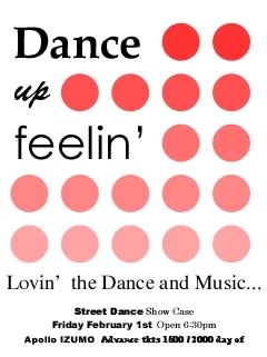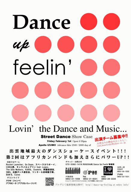 出雲最大のダンスショーケースイベント! Dance Up Feelin' 2nd 日時 2月1日(金曜日) 午後6時半開場予定 場所 出雲ライブハウスアポロ 料金 前売り 1500円 当日 2000円 出演予定チーム Rocket Launcher、So Dope、スペースカウボーイ、 CHIKA男、キャラメル☆プリン feat. Logos、 The Silly Walkers、KiARA、5semrin、阿羅部須宮、 SMG、出雲ダンス連合会、リッキー&赤崎親子隊、 BAN'$、Curea ゲストライブ ゲタオ (ジャンベ) アフロビータ (アフリカンミュージック) ☆まだまだ出演チーム募集して