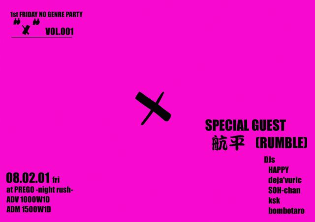 管理人様、告知失礼致します。 オールジャンルパーティー、"X"vol.1明日開催です!!! 2/1(Fri) "X"vol.1 @PREGO〜night rush〜 OPEN&START⇒22:00 ¥1,500(1drink込) ☆GUEST DJ☆ 航平(☆RUMBLE☆) ★DJ★ HAPPY deja'vuric SOH-chan ksk bombotaro あらゆるジャンルの"音"が楽しめる数少ないパーティーです! お時間ある方、ぜひ明日はPREGOにお越し下さい♪宜しくお願い致します。