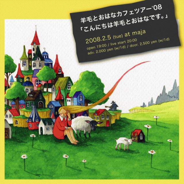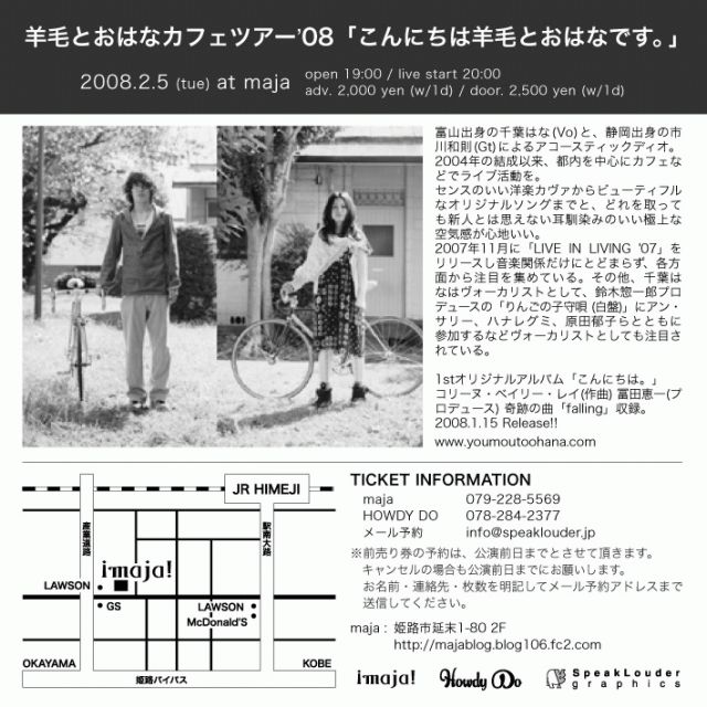 新曲がなんと、コリーヌ・ベイリー・レイ(作曲)×冨田恵一(プロデュース)!!!!!!! i Tunes Music Store ヴォーカルジャンル シングル&アルバム部門1位独占!! 姫路初登場にして、 ワンマンライブです。 羊毛とおはなカフェツアー’08 「こんにちは羊毛とおはなです。」 ◆08年2月5日(火) LIVE:羊毛とおはな http://youmoutoohana.com/ http://mixi.jp/view_community.pl?id=505515 open19:00 / live start 20:00 adv.2,000yen(w/1d) / door.2,500yen(w/1d) ●会場● maja (マハ) 兵庫県姫路